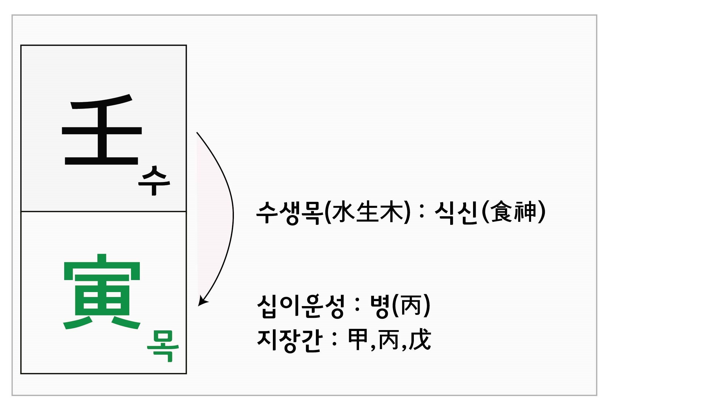 천간 임수가 일지 인목을 수생목하고 같은 양(陽)의 글자이므로 십신이 식신에 해당합니다. 지장간은 갑(甲, 비견), 병(丙, 편재), 무(戊, 편관)로 이루어져 있습니다.