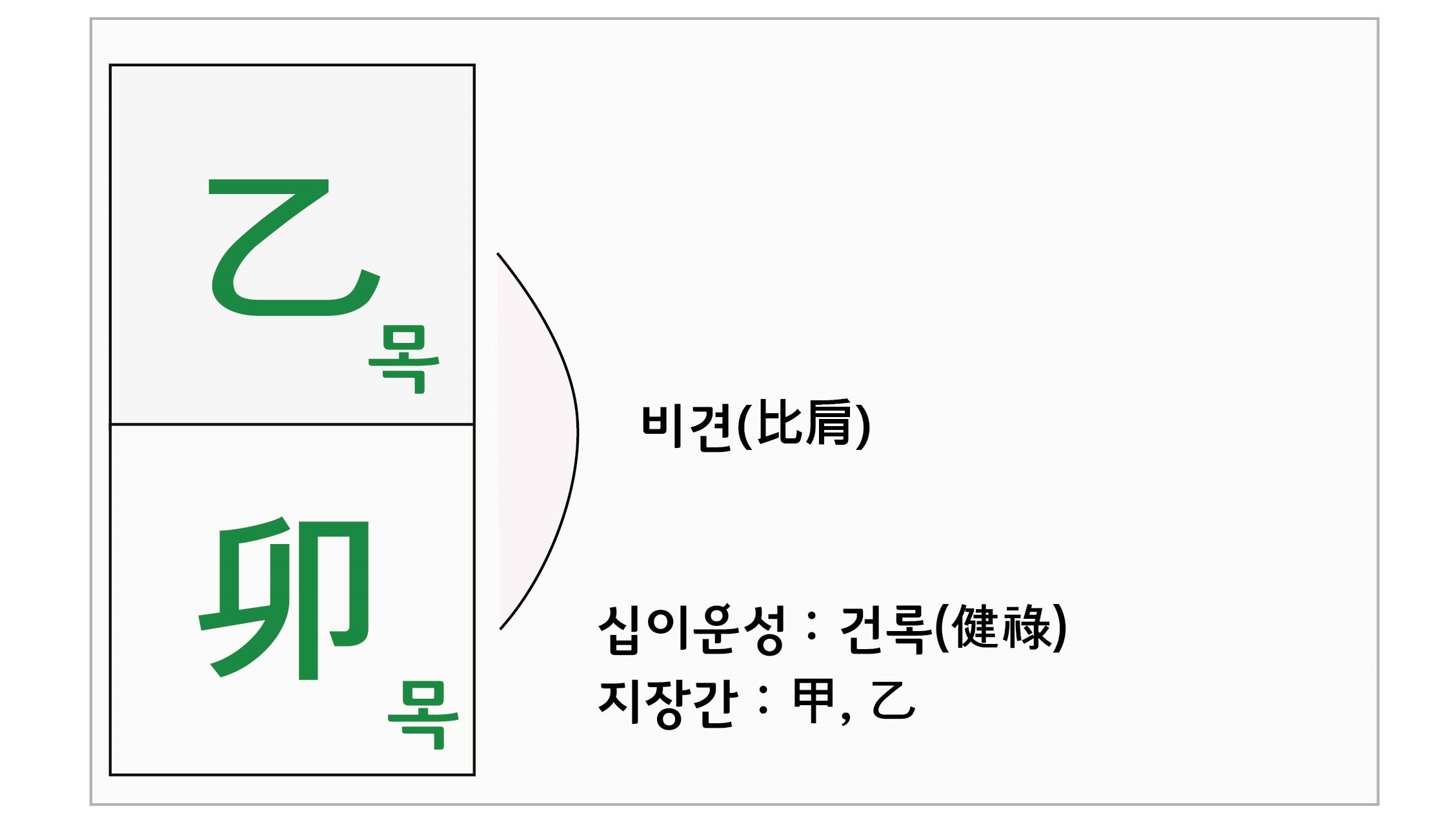 천간 을목(乙)과 지지 묘목(卯)이 같은 오행으로 간여지동이고 십신은 비견에 해당하고 십이운성은 건록입니다. 지장간은 갑(甲) 겁재), 을(乙) 비견으로 순수한 목의 성분으로만 이루어져 있습니다.